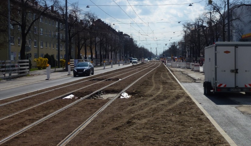 Tram 14 – the new stretch of track along Fürstenreider Strasse, in west Munich, between Pasing and Gondrellplatz.
