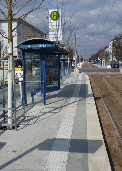 The new tram halt at Aindorferstrasse, along Fürstenreider Strasse, with platform, flag and shelter.