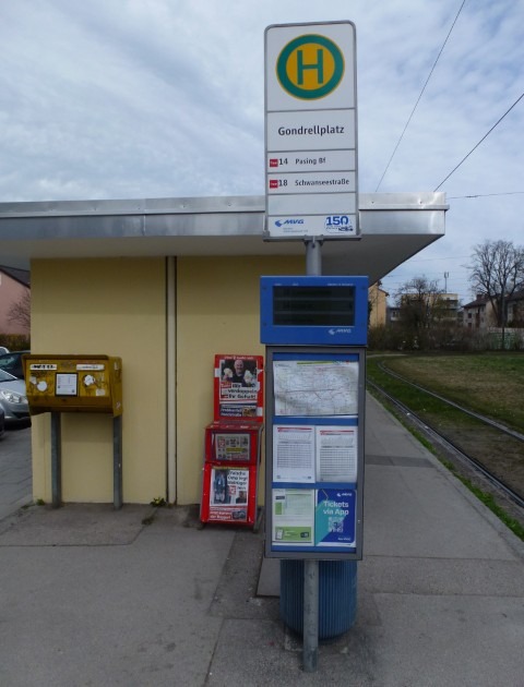 At the tram 14 terminus at Gondrellplatz, the tram halt pole hosts plenty of information: all that you could want at a glance (without consulting your smart phone). This includes a digital screen showing the next three departures (tram 18 also shares this terminus), two paper timetables for each route providing a line diagram of each route (and average journey times), plus the departure times from this stop; a map of the MVV fare zones and a fare prices table for each combination of zones (helpful to know what fare to pay for longer distances into the outer districts and suburbs). Most tram stops on the network have a similar range of information on display.