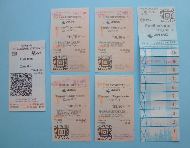 A single ticket (left), with single person day tickets (top two), then two group day tickets (bottom) and a stripe card ticket (you clip the number of stripes required for each single journey).