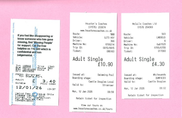 My bus fares for this trip, as at 12 January 2026: adult single, Dumfries to Castle Douglas, £4.30; adult single, Castle Douglas to Stranraer, £10.90; adult single, Stranraer to Cairnryan, £3.40. I also paid £2.30 for a single trip on the Translink bus 96 from the Belfast Stena terminal to the city centre.